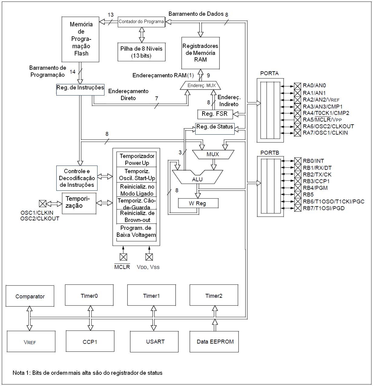 Reset principal. Quando configurado como MCLR, este pino representa uma reinicialização do dispositivo. ativa em nível baixo. A tensão no MCLR/VPP não pode exceder a VDD durante a operação normal do dispositivo. |