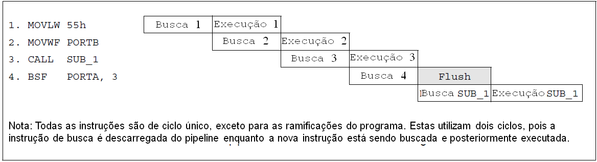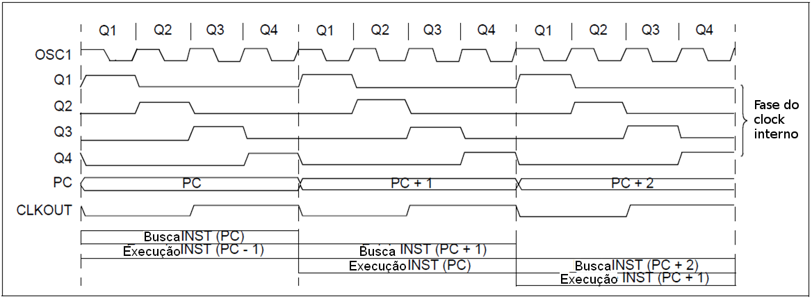 A entrada de clock (pino RA7/OSC1/CLKIN) é internamente dividida por quatro, de forma a gerar quatro clocks em quadratura não sobrepostos, a saber Q1, Q2, Q3 e Q4. Internamente, o contador de programa (PC) é incrementado a cada Q1, a instrução é buscada na memória de programa e guardada no registrador de instruções em Q4. A instrução é decodificada e executada durante os ciclos Q1 a Q4 seguintes. Os clocks e o fluxo de execução da instrução são apresentados na Figura 3.2.