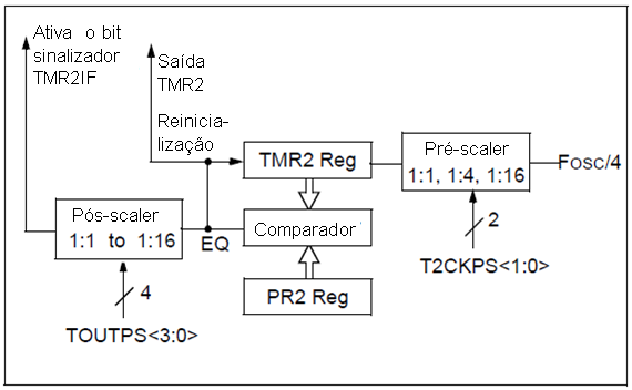 A saída de match (equivalência) do Timer2 passa por um pós-scaler de 4 bits (que fornece proporções de 1:1 até 1:16, inclusive) para gerar uma interrupção do Timer2 (armazenada no bit de sinalização TMR2IF, (PIR<1>)).