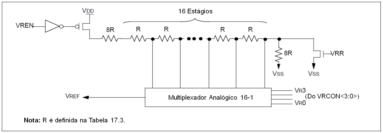O intervalo completo de VSS até VDD não pode ser abrangido devido à construção do módulo. Os transistores nas partes superior e inferior da rede de resistores em escada (Figura 11.1) impedem a VREF de se aproximar de VSS ou de VDD. O módulo de Referência de Tensão é derivado de VDD, e portanto a saída da VREF se altera com as flutuações de VDD. A precisão absoluta testada do módulo de Referência de Tensão pode ser encontrada na Tabela 17.3.