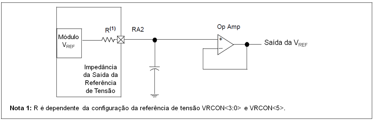 O módulo de Referência de Tensão opera independentemente do módulo Comparador. A saída do gerador de referência deve estar conectada ao pino RA2 se o bit TRISA<2> estiver ativado, e se o bit VROE, VRCON<6>, estiver ativado. A habilitação da saída do módulo de Referência de Tensão para o pino RA2 com um sinal de entrada presente aumentará o consumo de energia. A conexão do RA2 como saída digital com a VREF habilitada também aumentará o consumo de energia.