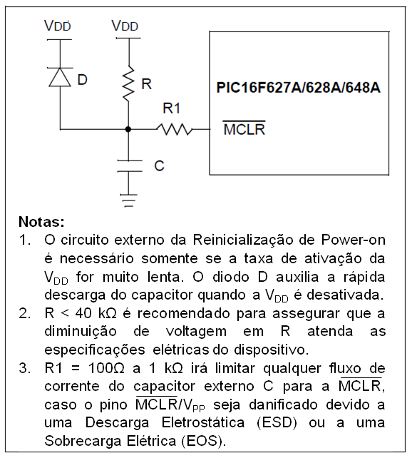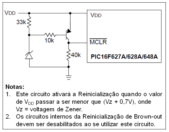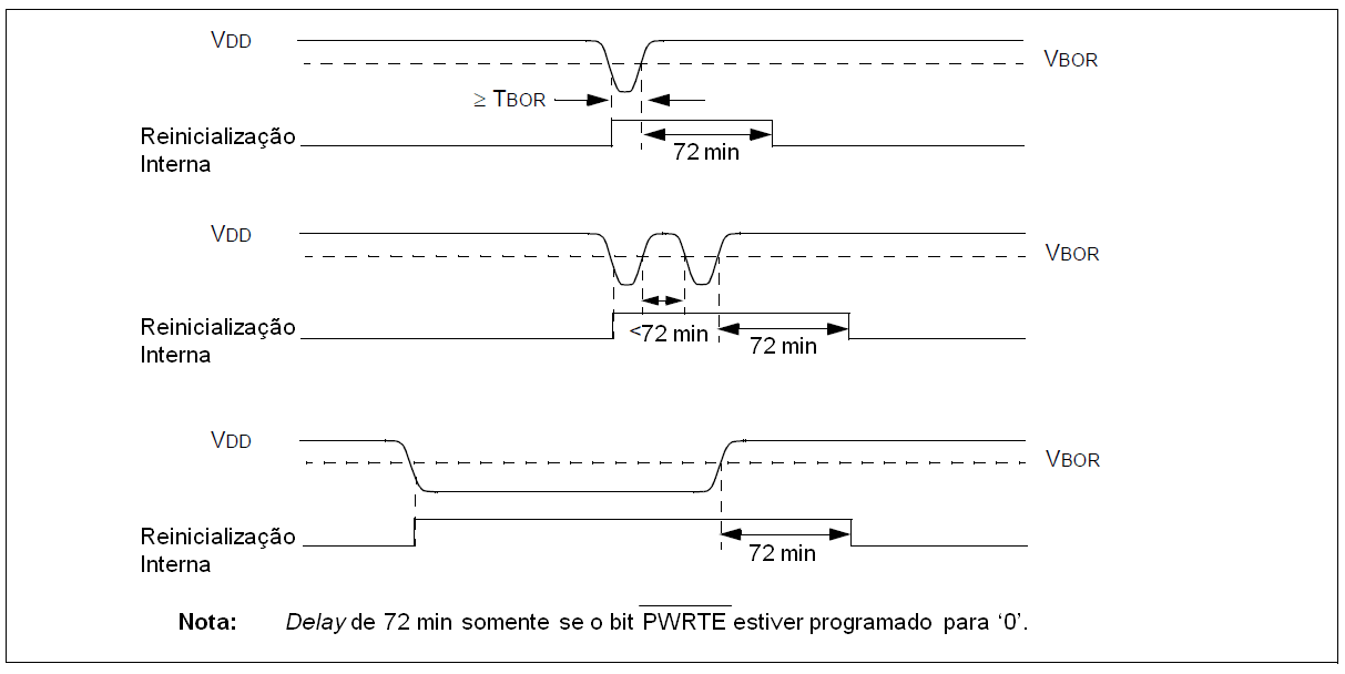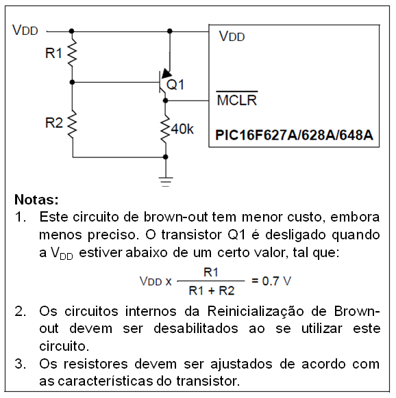 1: A habilitação da Reinicialização de Brown-out não habilita automaticamente o Temporizador de Ativação (PWRT), como ocorre nos dispositivos PIC16F627/628. |