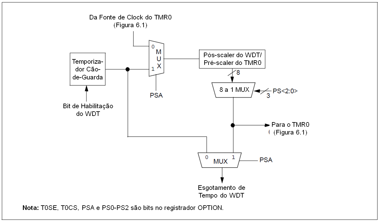 O WDT possui um período-limite de tempo nominal de 18 ms (sem pré-scaler). Os períodos-limite de tempo variam com a temperatura, com a VDD e com variações do processo de um dispositivo para outro (veja as Especificações de Corrente Contínua, Tabela 17.7). Se períodos-limite de tempo mais longos são desejados, um pós-scaler com uma razão de divisão de até 1:128 pode ser atribuído ao WDT sob controle do software, escrevendo-se no registrador OPTION. Portanto, períodos-limite de tempo de até 2,3 segundos podem ser obtidos.