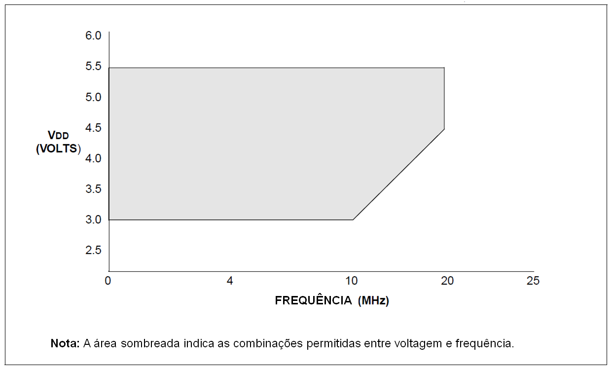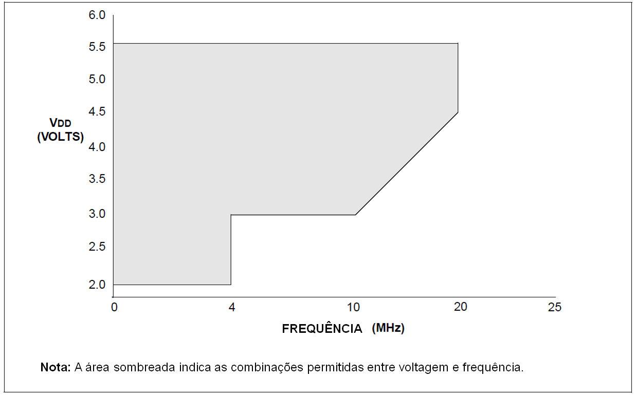 FIGURA 17.1: GRÁFICO VOLTAGEM-FREQUÊNCIA DOS PIC16F627A/628A/648A, -40°C ≤ TA ≤ +125°C