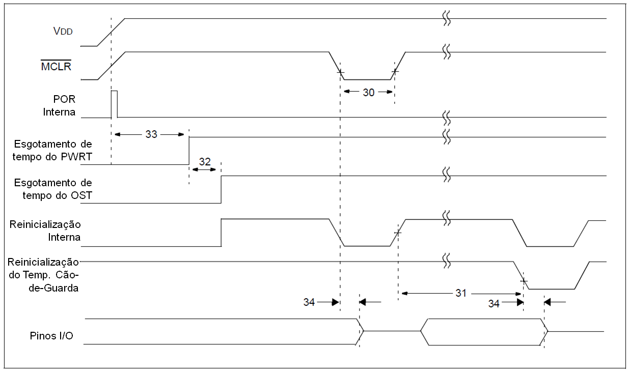 Veja a Seção 14.4 "Reinicialização de Power-on (POR), Temporizador de Ativação (PWRT), Temporizador de Inicialização do Oscilador (OST) e Reinicialização de Brown-out (BOR)" para detalhes sobre a Reinicialização de Power-on |