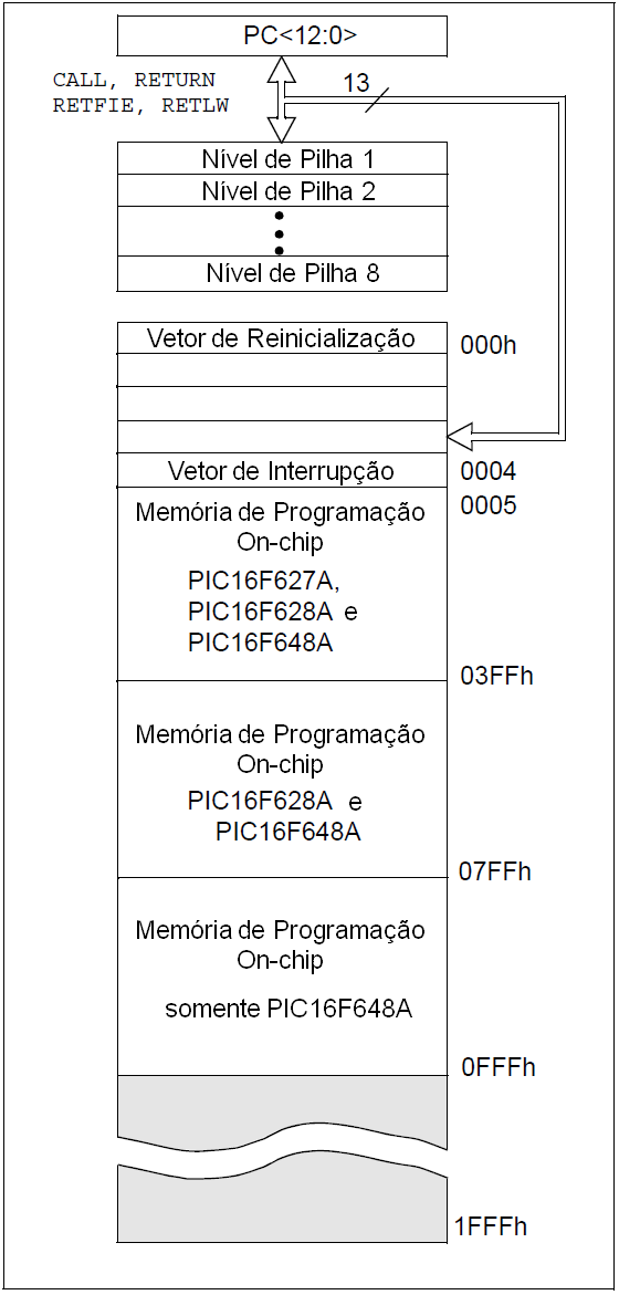 Os microcontroladores PIC16F627A, PIC16F628A e PIC16F648A possuem um contador de programa de 13 bits capaz de endereçar um espaço de memória de programação de 8K x 14. Somente os primeiros 1K x 14 (0000h-03FFh) para o PIC16F627A, 2K x 14 (0000h-07FFh) para o PIC16F628A e 4K x 14 (0000h-0FFFh) para o PIC16F648A são fisicamente implementados. Acessar uma posição além destes limites causará um wrap-around dentro do primeiro espaço 1K x 14 (PIC16F627A) ou 2K x 14 (PIC16F628A) ou 4K x 14 (PIC16F648A). O vetor de reinicialização fica em 0000h e o vetor de interrupção em 0004h (Figura 4.1).