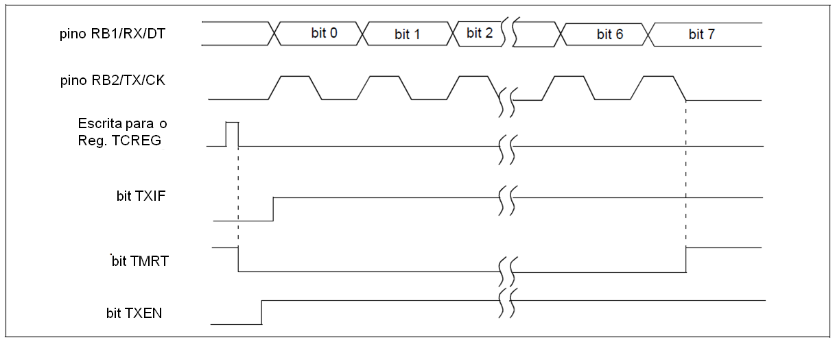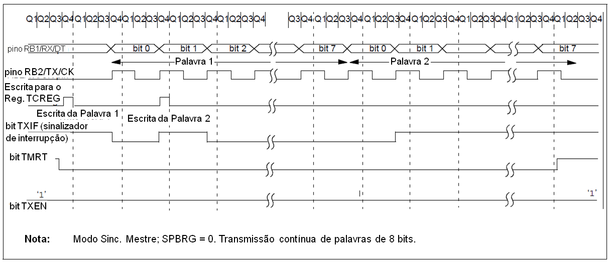 A transmissão é habilitada ativando-se o bit de habilitação TXEN (TXSTA<5>). A transmissão atual não ocorrerá até que o registrador TXREG tenha sido carregado com os dados. O primeiro bit de dados será deslocado para para a próxima borda de subida disponível no clock, na linha CK. A saída de dados é estável no entorno da borda de descida do clock síncrono (Figura 12.8). A transmissão também pode ser iniciada através do primeiro carregamento do registrador TXREG e da posterior ativação do bit TXEN (Figura 12.9). Isso é vantajoso quando taxas de transmissão lentas são selecionadas, uma vez que o BRG é mantido na Reinicialização quando os bits TXEN, CREN e SREN estiverem apagados. A ativação do bit de habilitação TXEN iniciará o BRG, criando imediatamente um clock de deslocamento. Normalmente, quando a transmissão é iniciada pela primeira vez, o registrador TSR está vazio, então uma transferência para o registrador TXREG resultará em uma transferência imediata para o TSR, resultando, por sua vez, em um TXREG vazio. Transferências back-to-back (consecutivas) são possíveis.